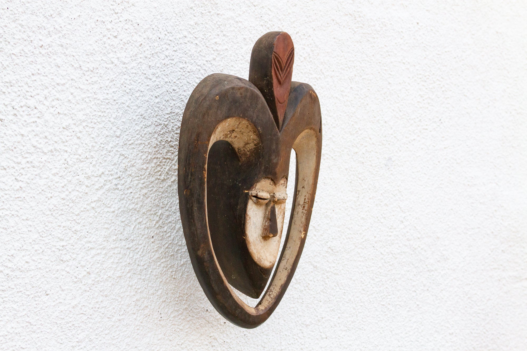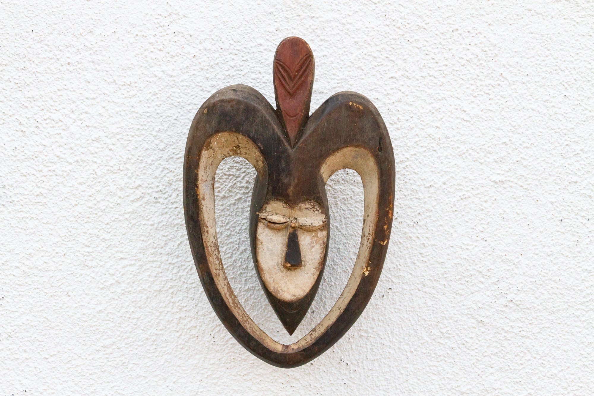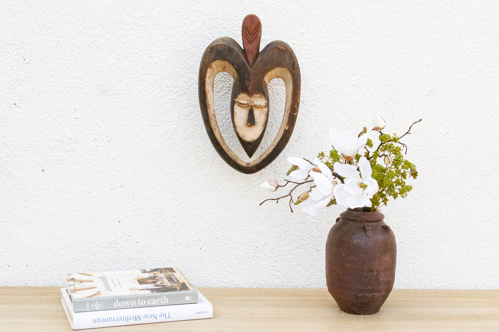 This charming Kwele mask from Gabon or the Republic of Congo is a delightful example of African tribal art. The mask is characterized by its simple yet expressive features, with a heart-shaped face, large, rounded eyes, and a small, closed mouth. The surface is adorned with geometric patterns and a warm patina, which suggests its age and use in dances and ceremonies. Kwele masks are often associated with social harmony and the honoring of ancestors. This mask would not only be a charming addition to any collection of African art but also a delightful accent in a modern home. Imagine it displayed in a child's room, a cozy living area, or even a kitchen, adding a touch of cultural richness and warmth. Its simple features and warm patina would complement a variety of interiors, from minimalist and contemporary to eclectic and bohemian. Consider pairing it with natural textures, like wood and woven fabrics, and warm earth tones to create a grounded and inviting space.