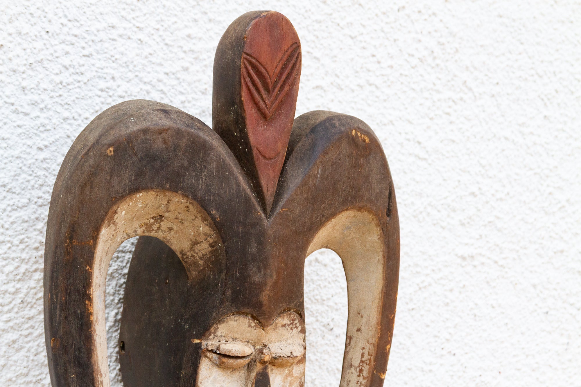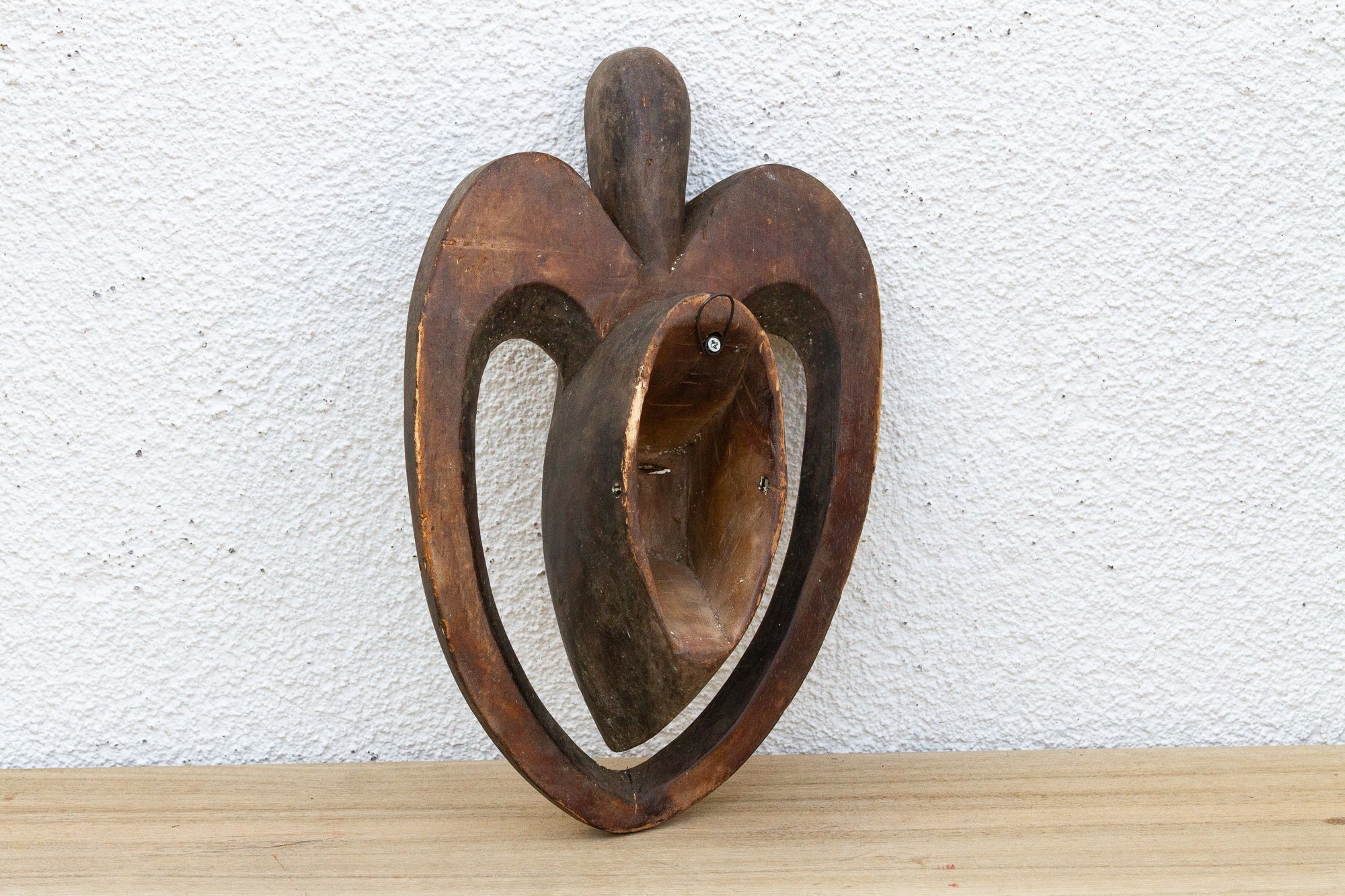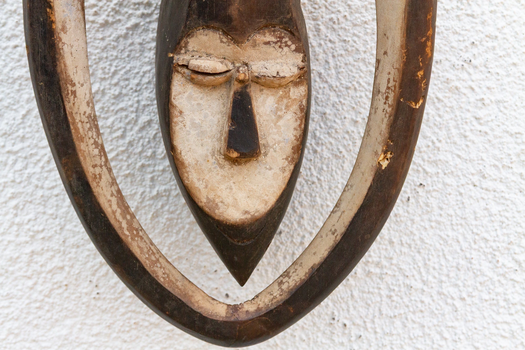 This charming Kwele mask from Gabon or the Republic of Congo is a delightful example of African tribal art. The mask is characterized by its simple yet expressive features, with a heart-shaped face, large, rounded eyes, and a small, closed mouth. The surface is adorned with geometric patterns and a warm patina, which suggests its age and use in dances and ceremonies. Kwele masks are often associated with social harmony and the honoring of ancestors. This mask would not only be a charming addition to any collection of African art but also a delightful accent in a modern home. Imagine it displayed in a child's room, a cozy living area, or even a kitchen, adding a touch of cultural richness and warmth. Its simple features and warm patina would complement a variety of interiors, from minimalist and contemporary to eclectic and bohemian. Consider pairing it with natural textures, like wood and woven fabrics, and warm earth tones to create a grounded and inviting space.