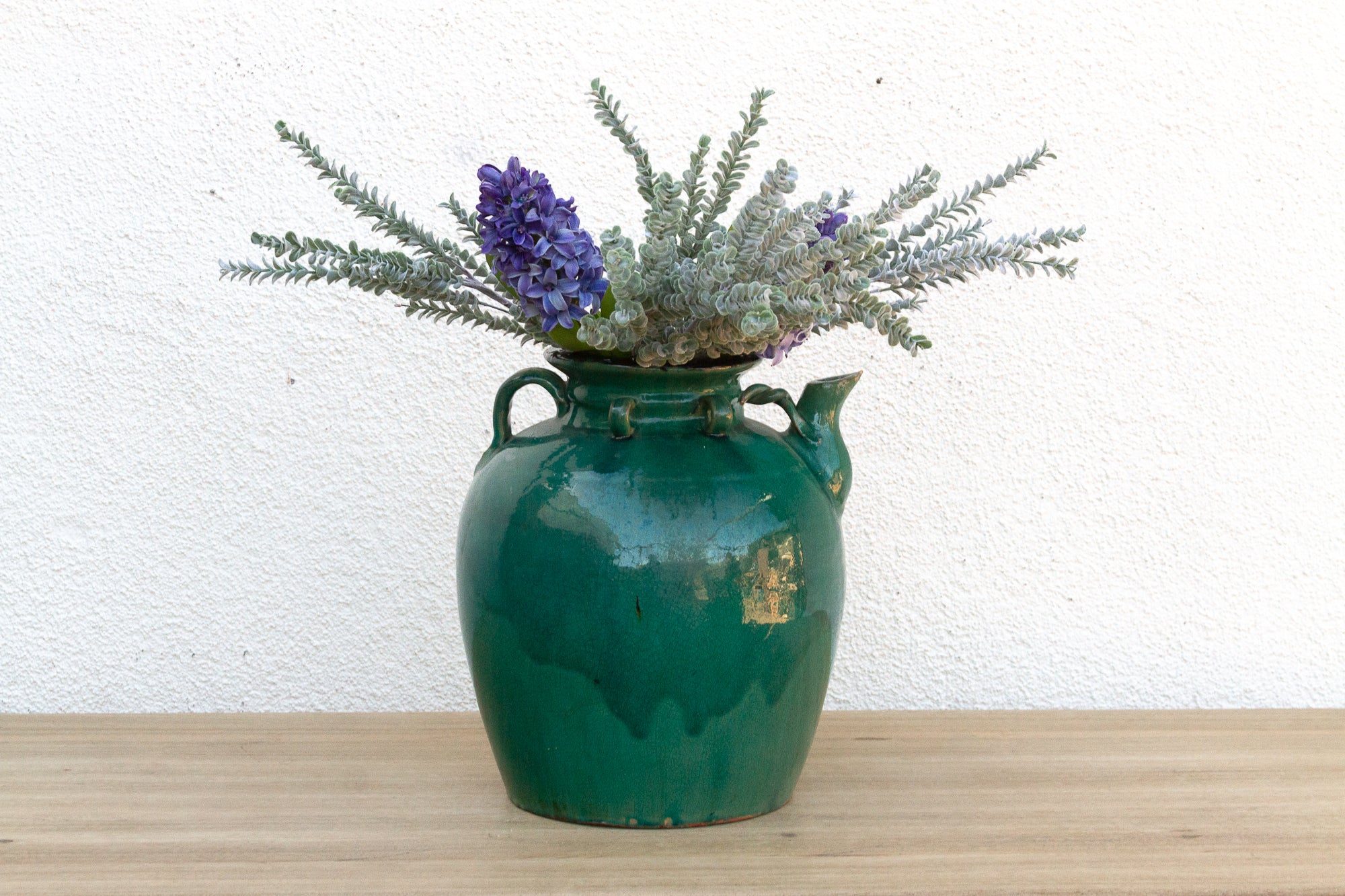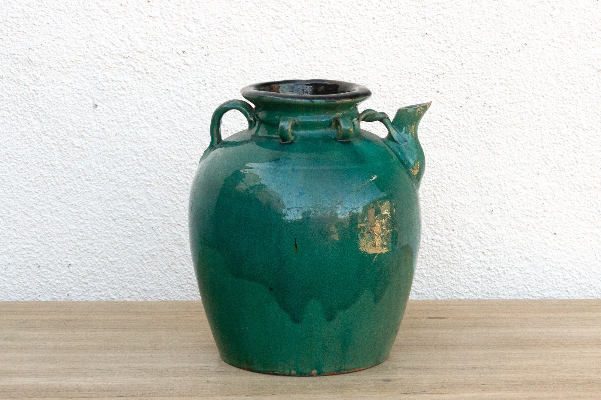 This antique pottery jar, bathed in a rich emerald green glaze, exudes a timeless charm and rustic elegance. Likely originating from China and dating back to the 19th century or earlier, the jar's rounded form and sturdy handles suggest its origins as a functional vessel. It was possibly used for storing water, oil, or other liquids, a testament to the enduring practicality of traditional pottery. The deep green glaze, with its subtle variations in color and texture, adds a touch of sophistication and visual interest. Imagine this jar gracing your kitchen, dining room, or living room, filled with fresh flowers or branches, or simply displayed as a decorative accent.