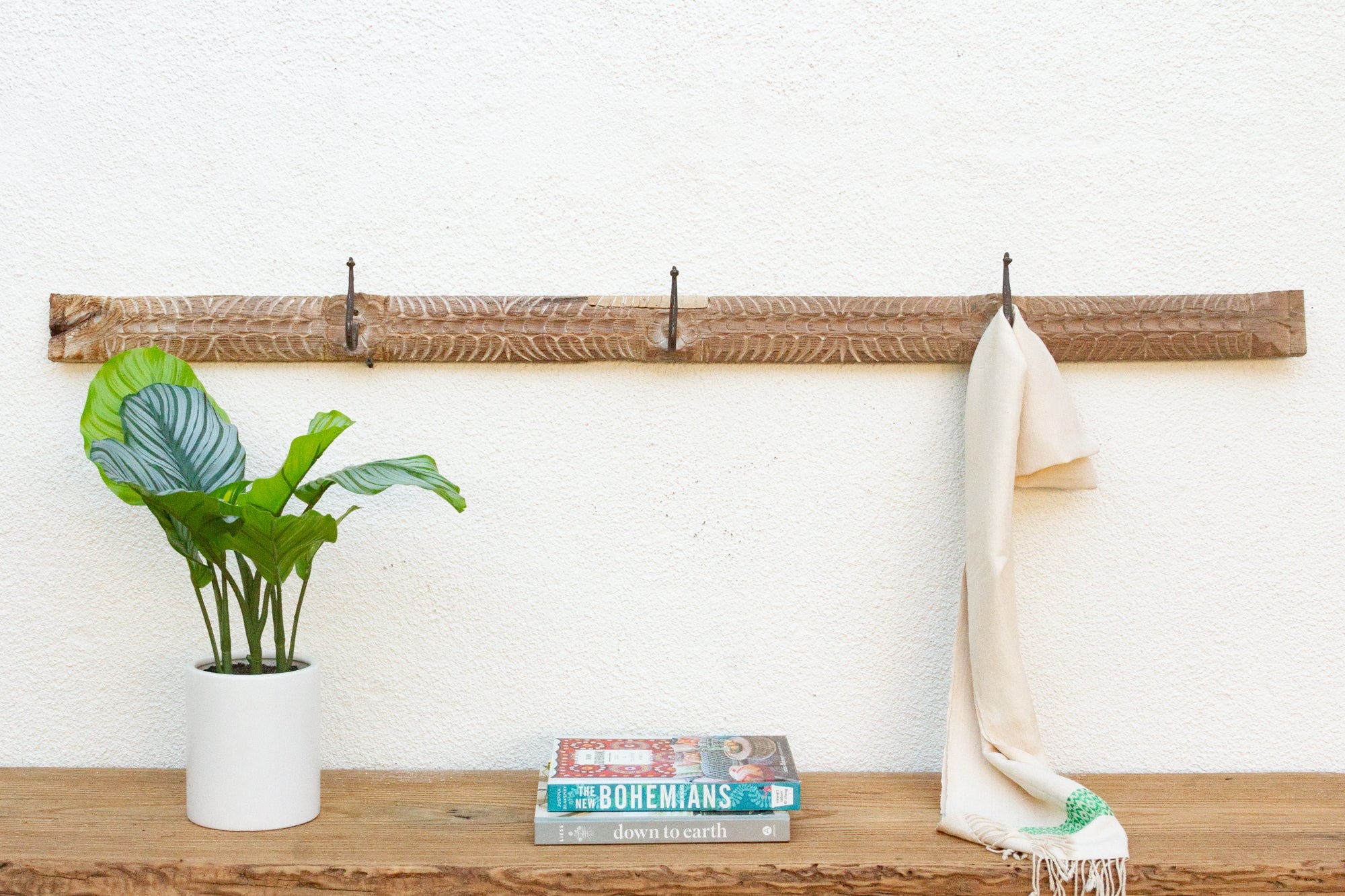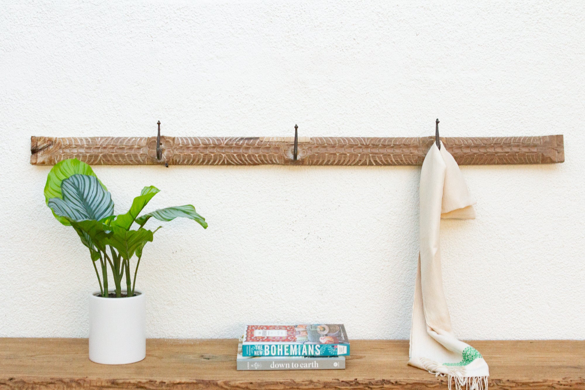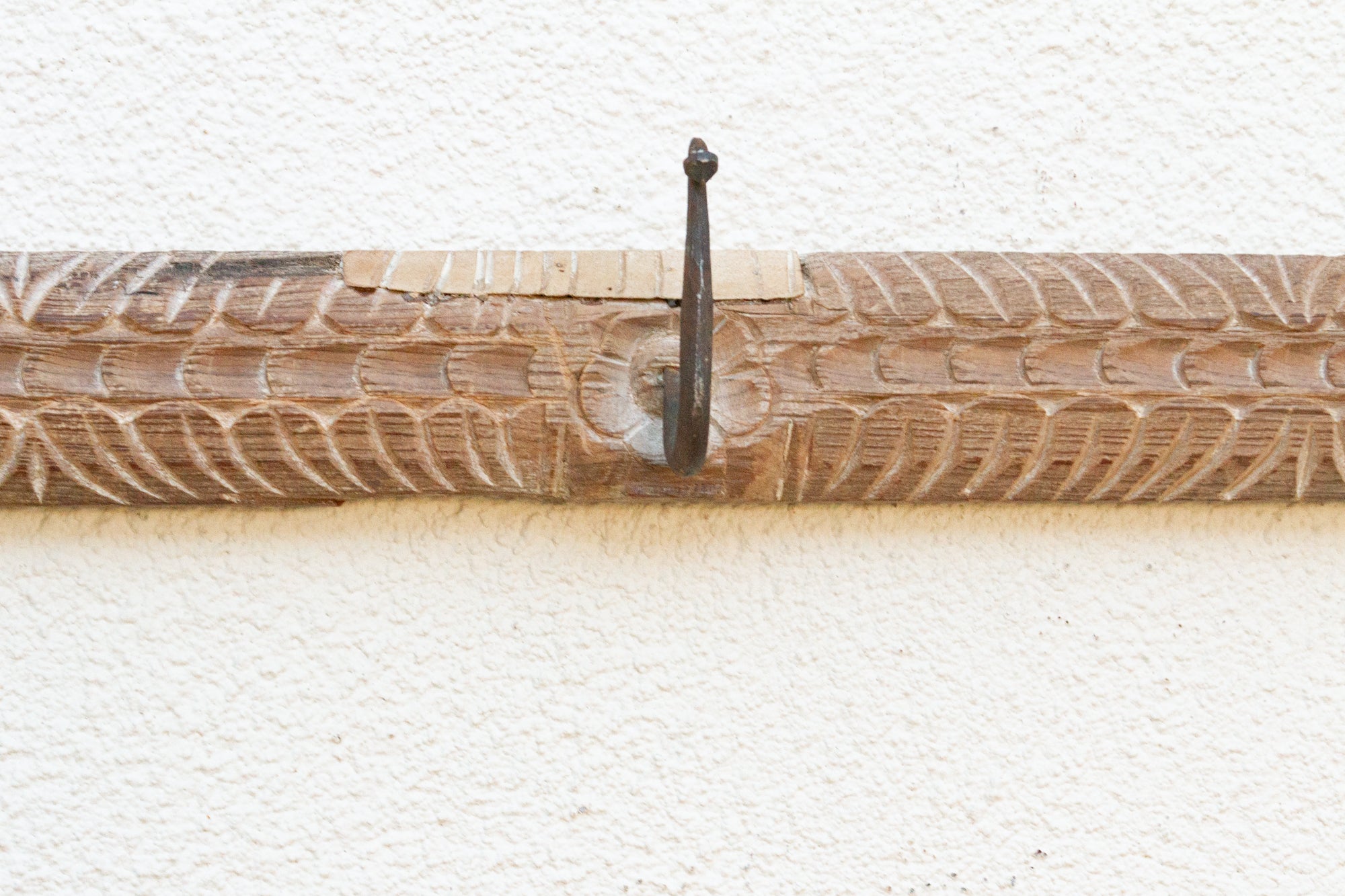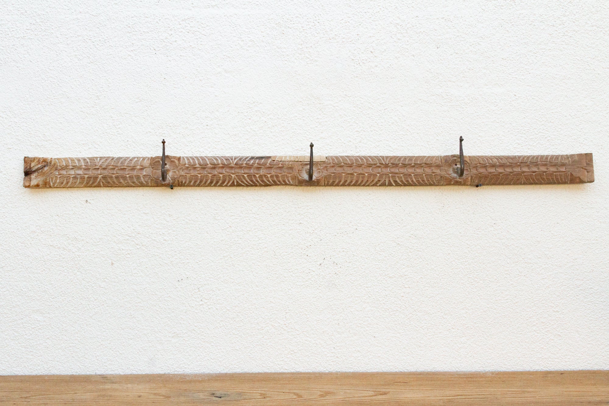 Add a touch of rustic charm to your home with this unique wall hook. Crafted from an antique southern Indian door lintel, this charming hook features carved lotus flowers and multiple iron hooks. The bleached wood patina on this carved wall panels adds a vintage aesthetic, while the carved details create a one-of-a-kind piece. Shows cracks and blemishes.