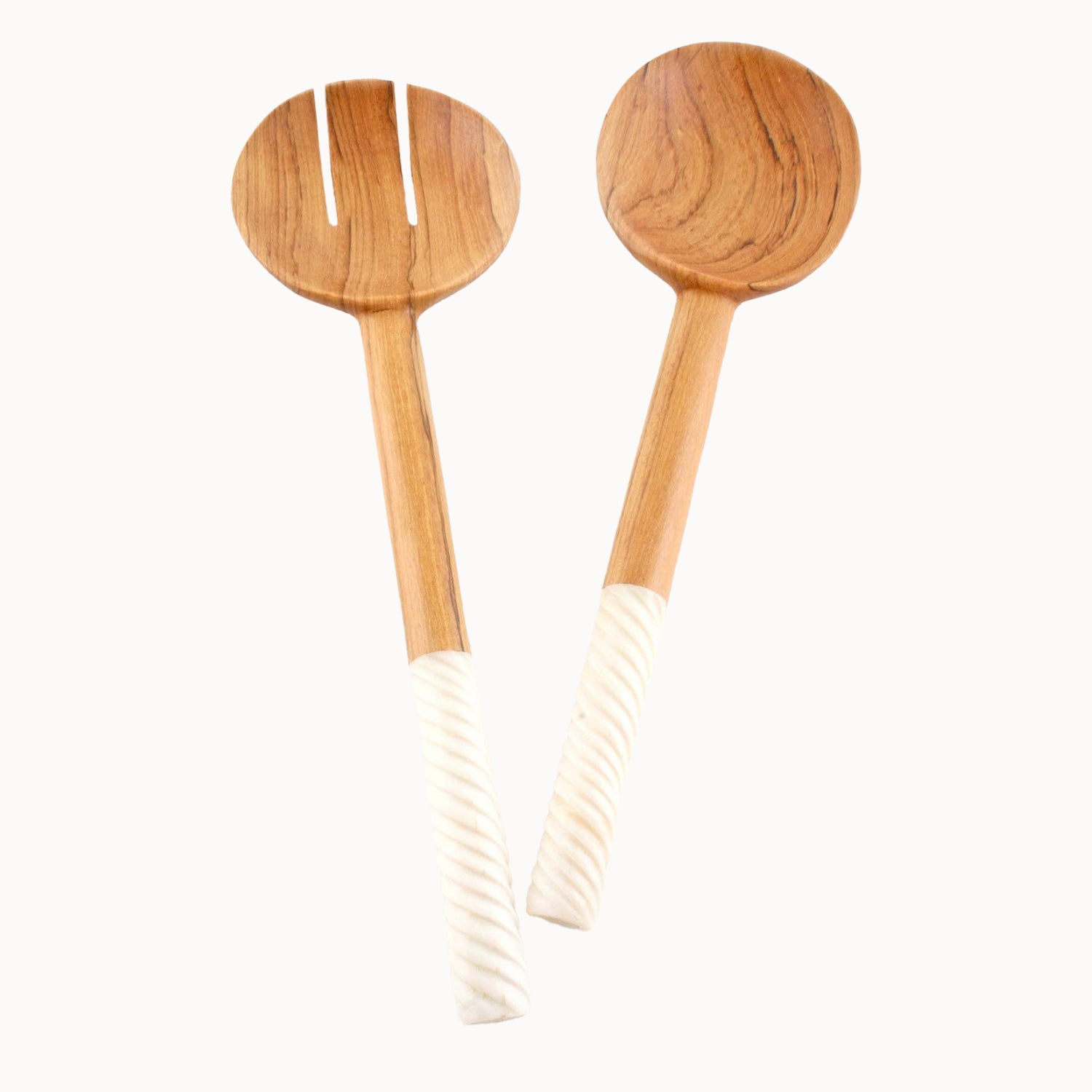 Beautifully crafted with spiral bone handles, these serving utensils can almost be considered works of art. The set includes a salad spoon and fork, each carved from wild olive wood and finished with a beige bone handle reminiscent of the antlers of savanna antelopes like the topi, springbok, waterbuck and gazelle. Wild olive is a wild tree native to East Africa, known for its brilliant grain patterns and durability.