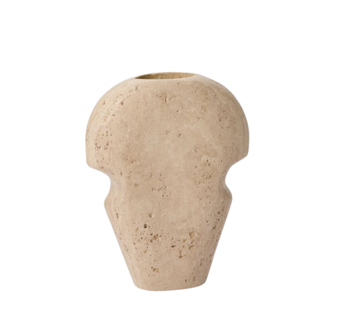 The handmade Klimt Vase, crafted from natural travertine marble, brings timeless, old-world character to any space. With its oval center opening, tapered base, rounded edges, and slim front-to-back profile, it makes a strong yet understated statement. Each piece is unique due to the natural stone, standing out whether styled with fresh or dried stems or displayed solo as a sculptural accent on a console or shelf.