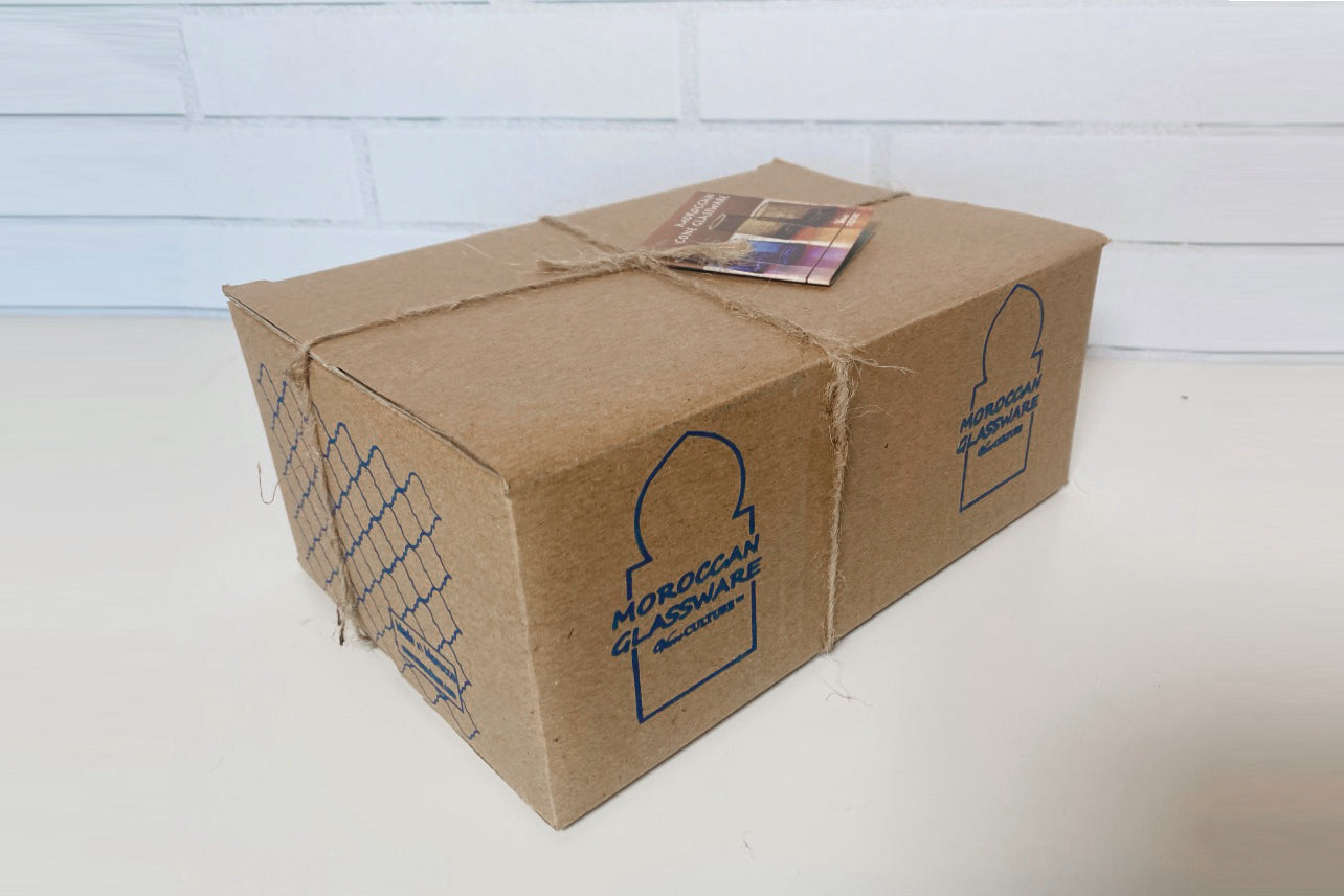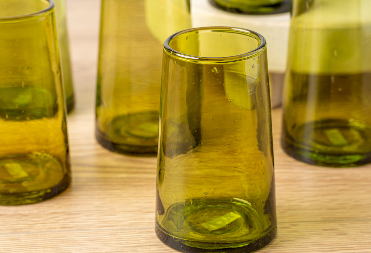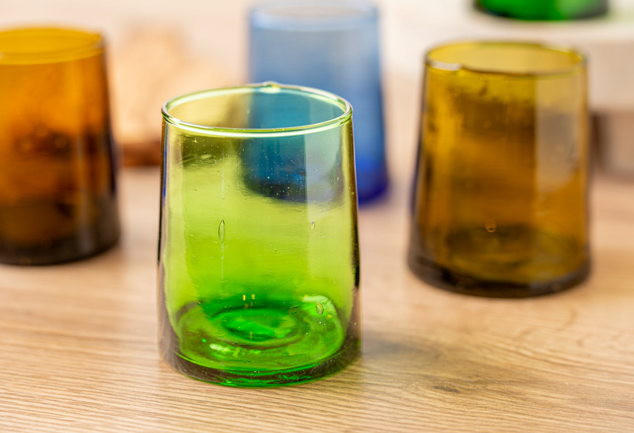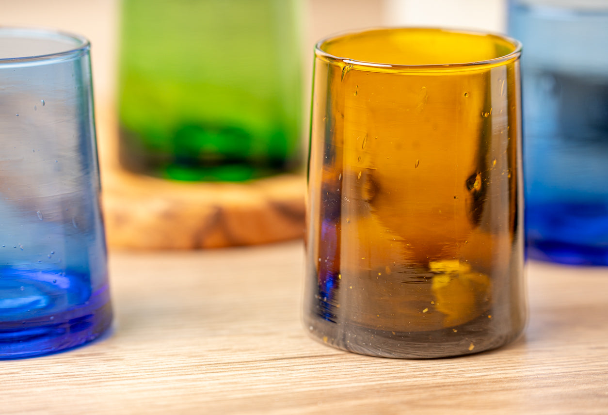Our Moroccan glassware sets come in four distinct shades of transparent glass (Clear, Amber, Blue & Green). The handblown construction is evident in the bubbles suspended in the glass itself, and the organic forms that the vessels take. Please keep in mind, that the artisans use recycled glass that is available at the time so the color shade will vary, especially in our amber glasses, they can either have a yellowish tint or a greenish tint.
