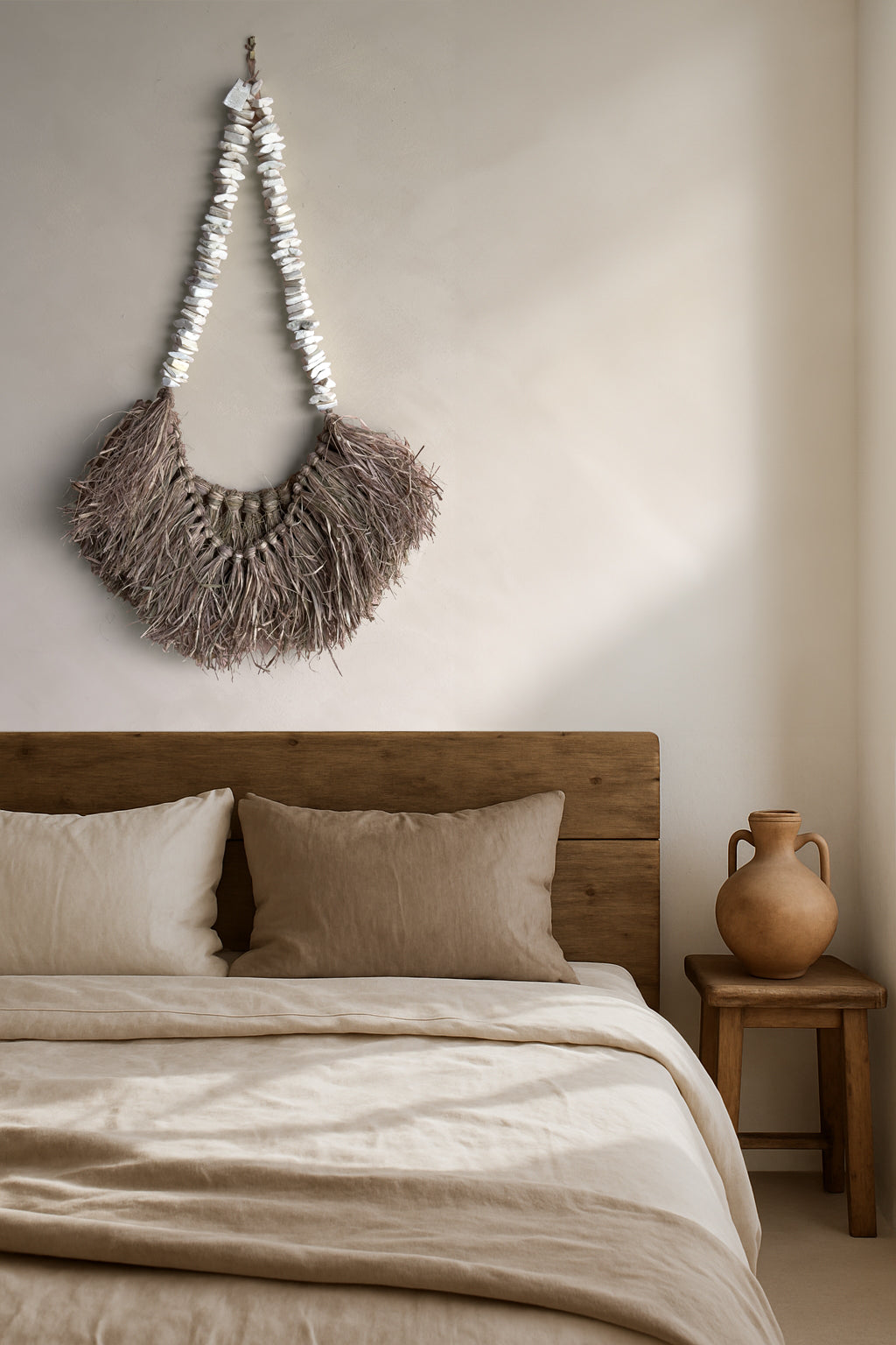 Richly layered raffia forms a natural double half-moon design, suspended from jute and accented with sculptural white sepia bone. This piece celebrates texture and materiality, bringing warmth and movement to any wall.