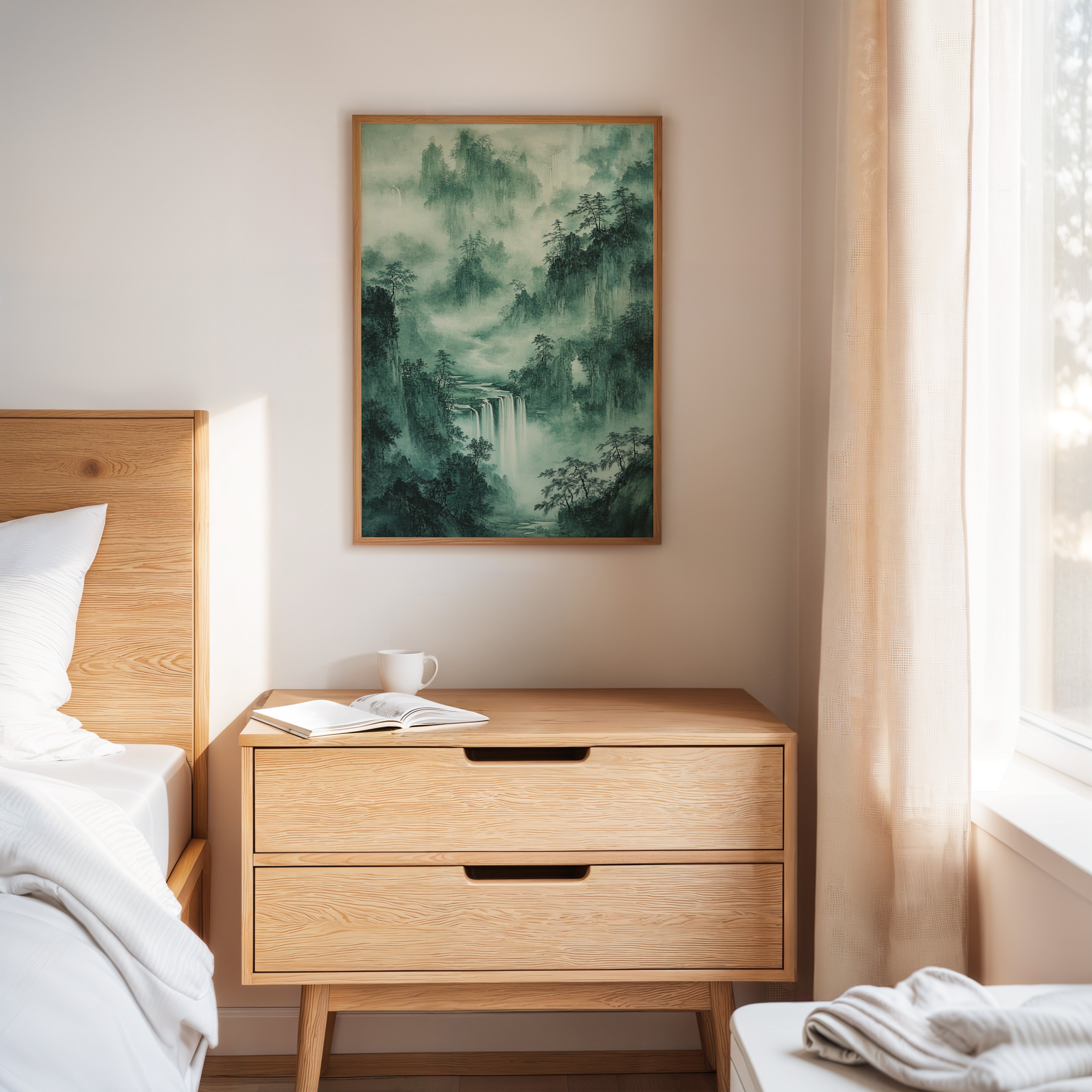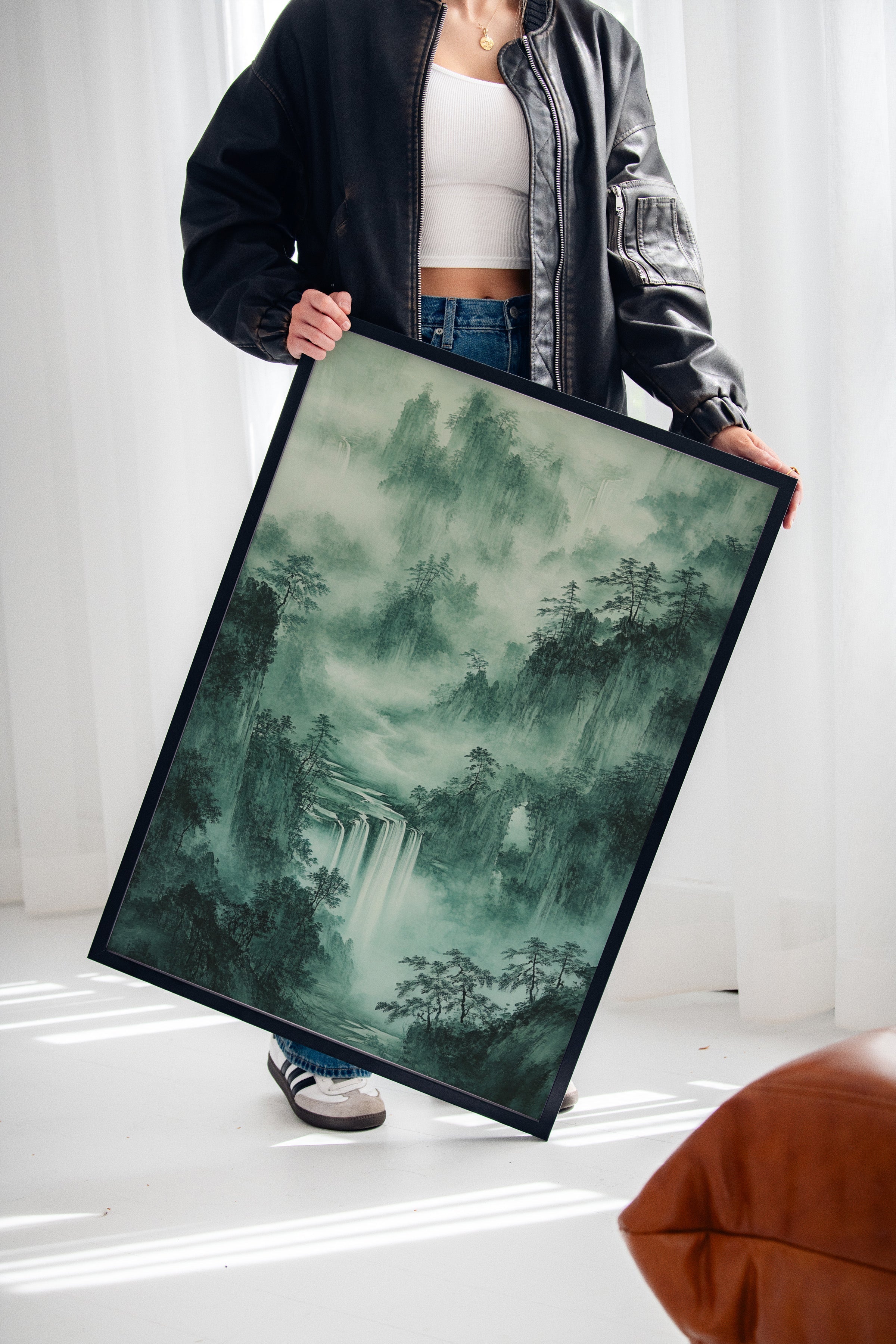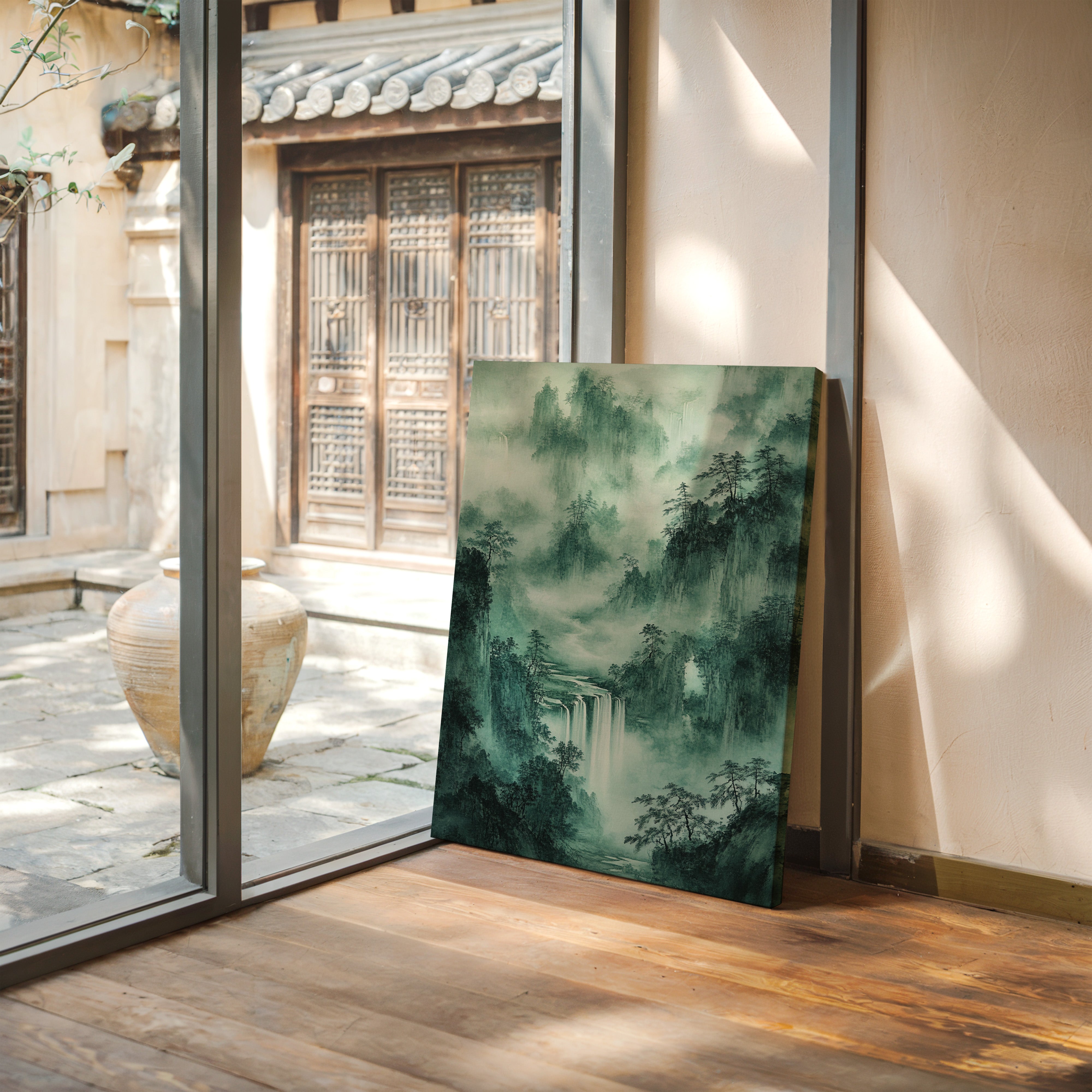 Invite the peaceful rhythm of nature into your space with the Serene Waterfall Landscape, a masterful tribute to traditional East Asian ink wash art. Inspired by classic Chinese and Japanese sumi-e techniques, this piece captures the quiet majesty of mist-shrouded mountains, cascading waterfalls, and ancient pines swaying in the breeze.