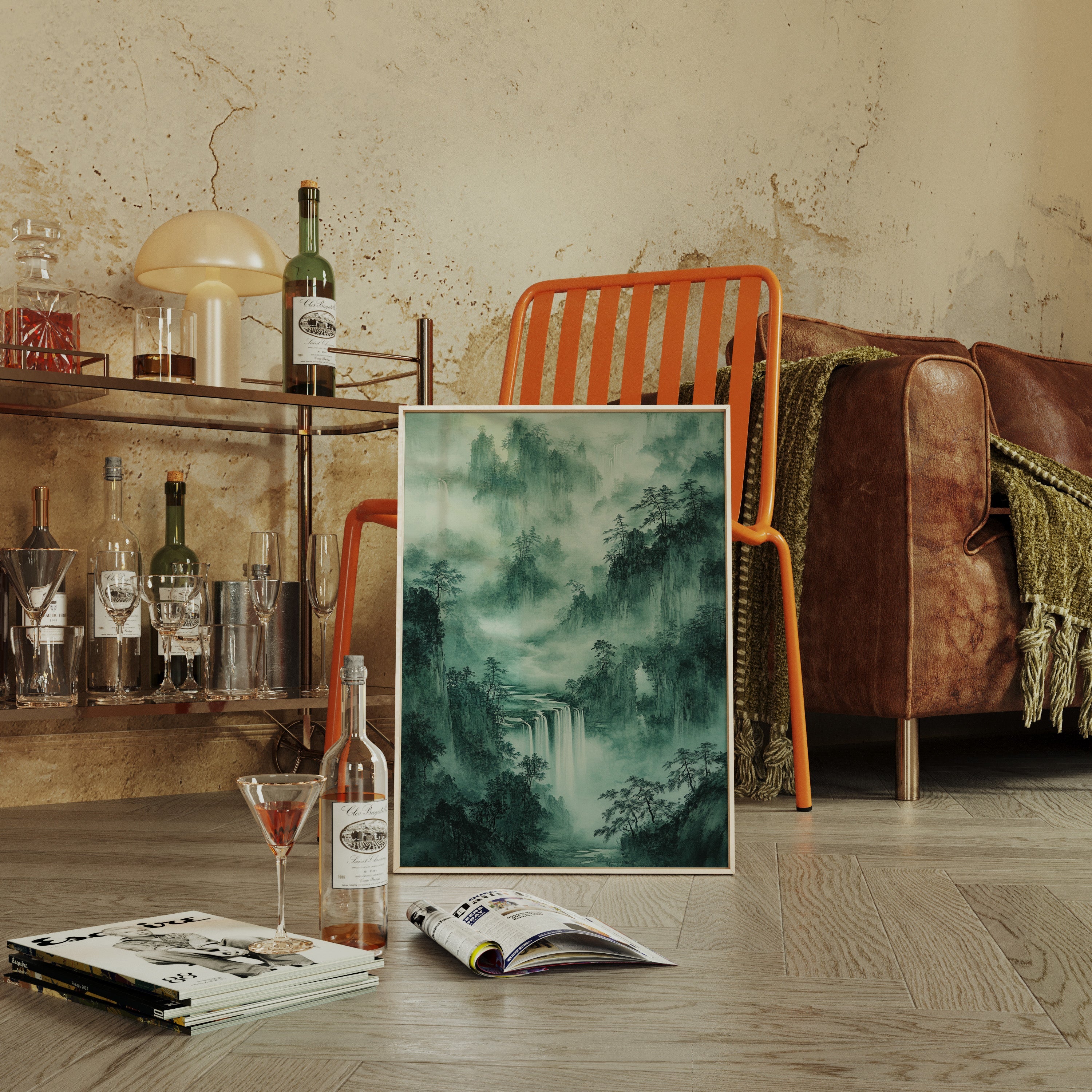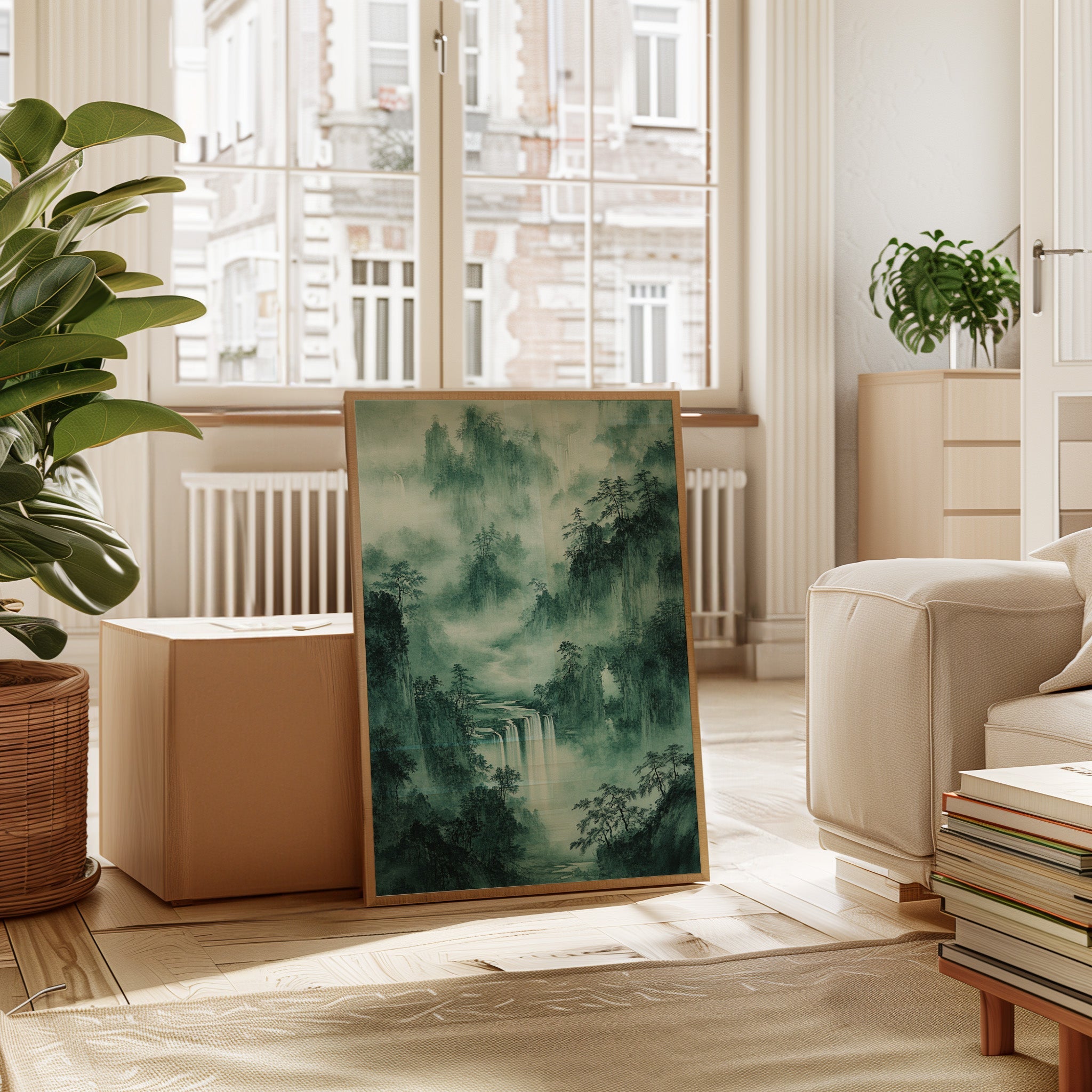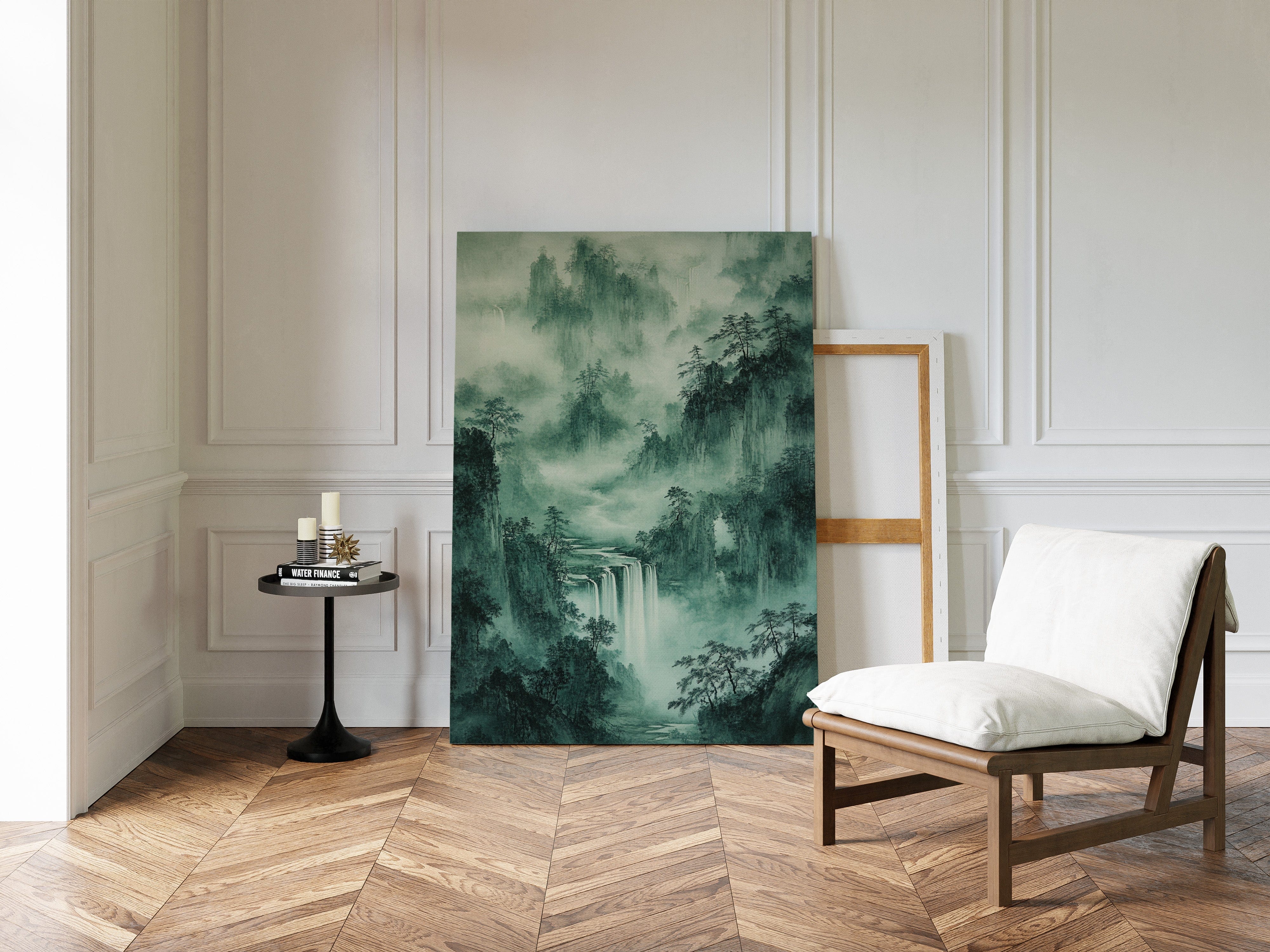 Invite the peaceful rhythm of nature into your space with the Serene Waterfall Landscape, a masterful tribute to traditional East Asian ink wash art. Inspired by classic Chinese and Japanese sumi-e techniques, this piece captures the quiet majesty of mist-shrouded mountains, cascading waterfalls, and ancient pines swaying in the breeze.