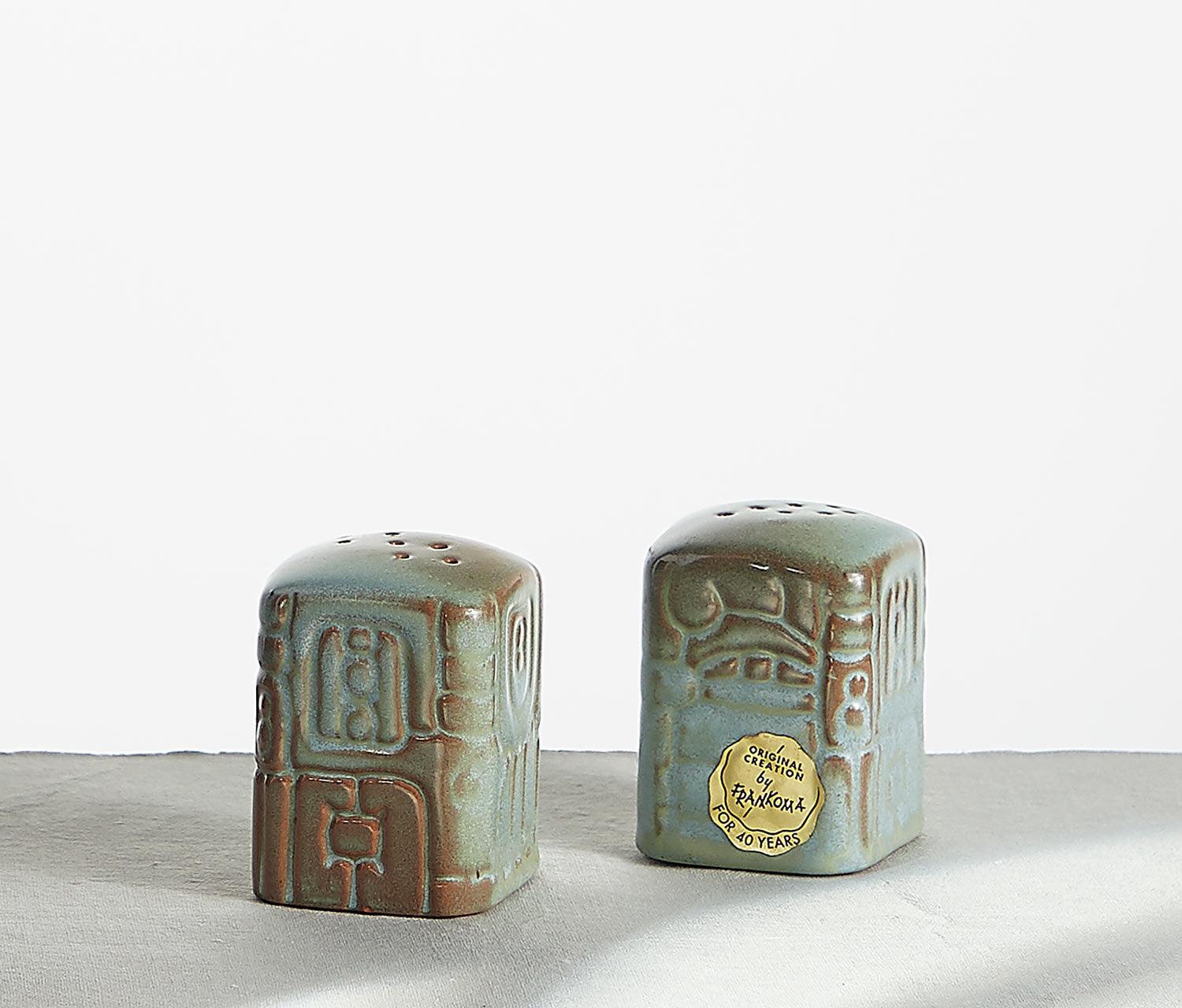 Add a little Mid-Century artisanal vibe to your table with this vintage Frankoma Myan Aztecs Salt & Pepper Shaker Set-in Woodland Moss glaze.